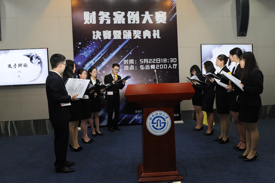 本次大赛竞争激烈,经过参赛资格审查、初赛、复赛和半决赛的层层筛选,最终有4支队伍进入决赛。决赛共分二组,每组对决共三个环节。第一个环节是案例展示,每队结合各自的PPT,针对具体的案列企业讲解财务分析的内容;第二个环节是选手相互提问,短兵相见开展辩论;第三个环节是评委提问,由现场评委对参赛队伍提出的观点或相关知识进行提问。经过紧张、激烈的角逐,大赛最终评选出一等奖一个队、二等奖三个队、三等奖七个队,以及一个最佳案例编写奖和一个最佳辩手奖。