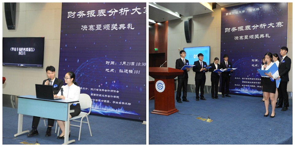 本次财务报表分析大赛报名参赛的学生队伍110支,历时一个多月、通过初赛、复赛、半决赛的重重考验,最终4支队伍脱颖而出,进入决赛。决赛通过DV/情景剧表演、案例展示、双方提问辩论、评委及观众提问等环节,经过评委打分评选出了一等奖队伍2支。此外,本次大赛还评选出了二等奖队伍6支、三等奖队伍8支。