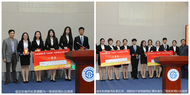 省注协副秘书长郭正苏、西财职称学院副院长谭洪涛为二等奖获得队伍颁奖